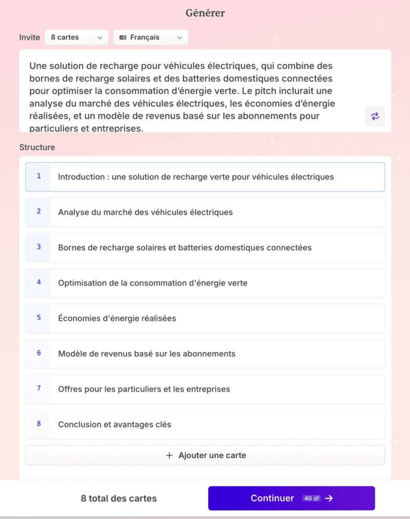 1. Then click “Continue” to have Gamma AI generate your presentation, then adjust it as needed. Thanks to its intuitive interface, you can change the content, theme and style of each slide with a single click. The tool also allows you to add pages with predefined layouts to focus solely on the content.